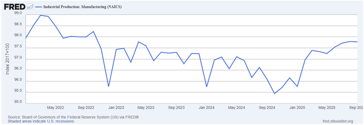 Consider the Atlanta Fed GDPNow economic forecast for U.S. real GDP for 2025 Q3, which is projecting 3% to 3.5% growth during the most recently completed quarter.  No recession here.