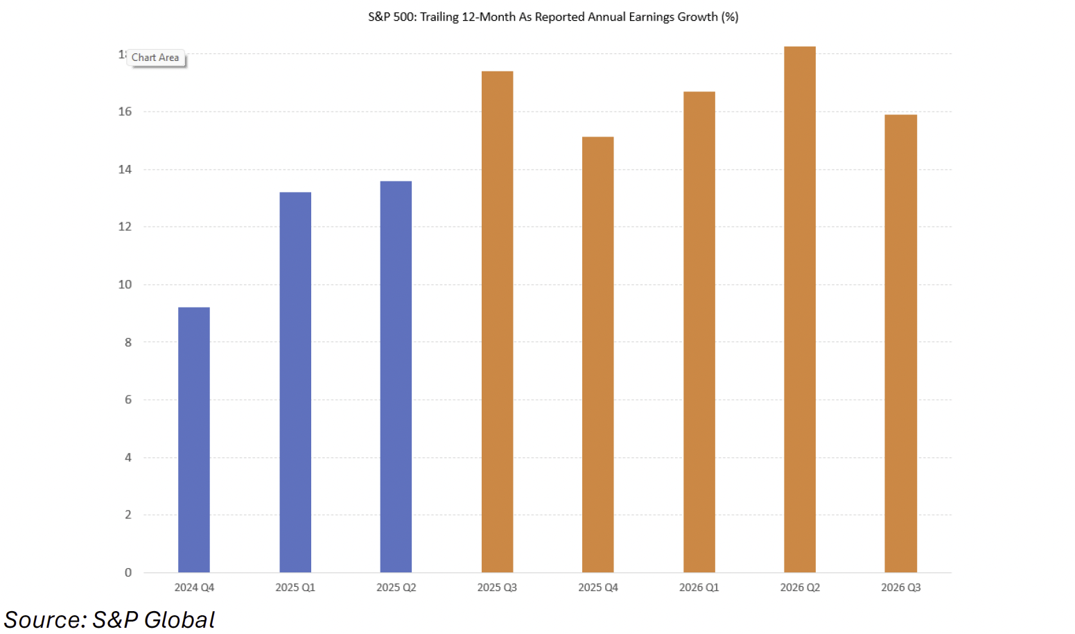 So why do we as investors care so much about the economic growth outlook?  Because Real GDP growth is the primary determinant of corporate profit growth, which is the primary determinant of stock market performance.  And when it comes to projections for earnings growth in the upcoming quarters according to S&P Global, the outlook remains strong with projections in the mid- to high teens.  These are the type of fundamentals that, if realized, typically support high stock prices over time.