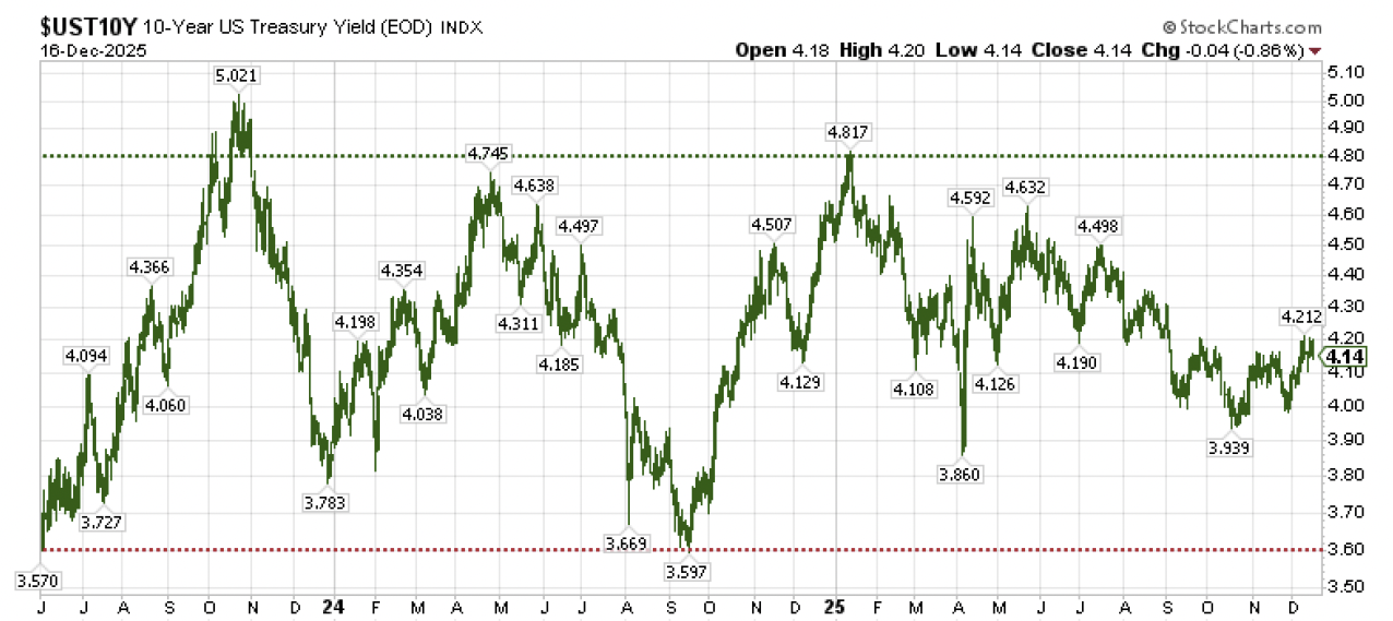 This highlights an important point about bonds as we move through the coming year.  Bonds have been rangebound dating back to the start of the AI boom in the summer of 2023, moving back and forth in a range between 3.60% on the low side and 4.75% to 5.00% on the high side (important note: bond prices move inversely with yields – higher yields, lower bond prices; lower yields, higher bond prices).  As shown in the chart above, we started 2025 with yields at or near the very high end of this range.  And we are ending the year toward the lower end of the range, as the 10-year U.S. Treasury yield has been hard pressed to move sustainably below 4.00% for more than a year now.  So while 2025 may have been a surprisingly good year for bonds, we should not be surprised if 2026 ends up being an unexpectedly disappointing year for bonds at they continue to travel back and forth in this trading channel, neutralized by easier monetary policy on the positive side being offset by persistent concerns about higher inflation on the negative side (inflation is the primary determinant of bond market returns – the outbreak of inflation in 2022 caused bonds to drop -13% that year, after all).  Returns are likely to be positive overall for bonds thanks to the +4% coupon income being clipped, but total returns may be marginally less in the 2-4% range for the year when it’s all said and done.  And if we do get an outbreak of inflation in 2026, all bets are off for bonds outside of short duration instruments.