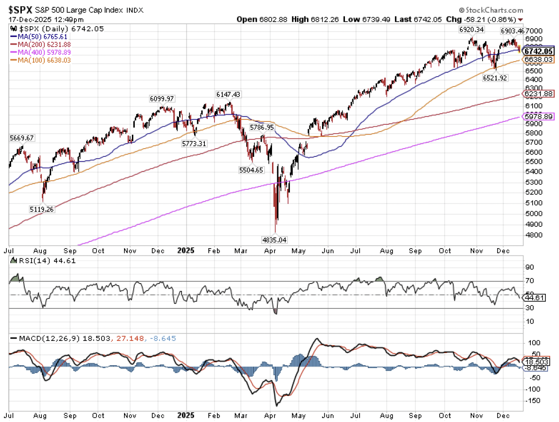 Stocks.  The U.S. stock market continues to rise as we head toward 2026, but cracks are increasingly emerging.  Let’s start with a look at the charts for context.