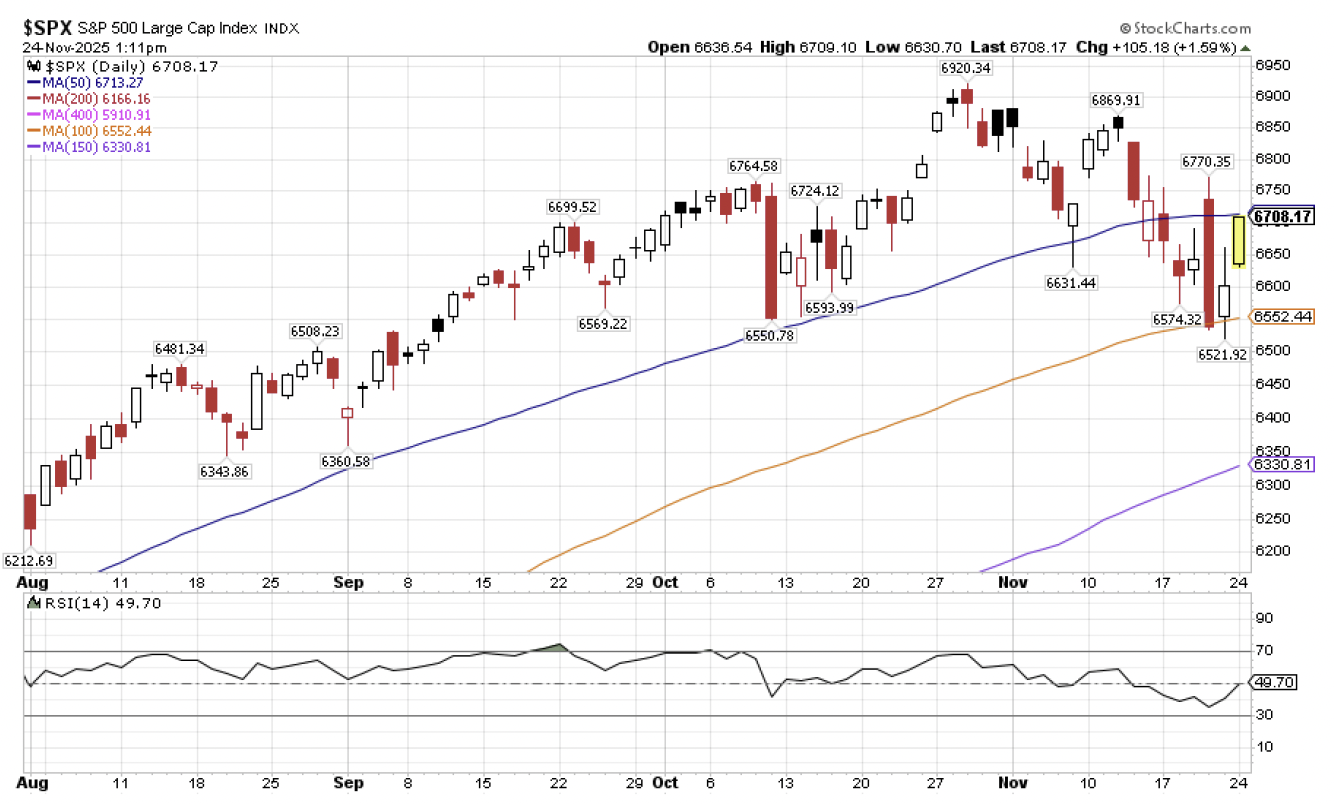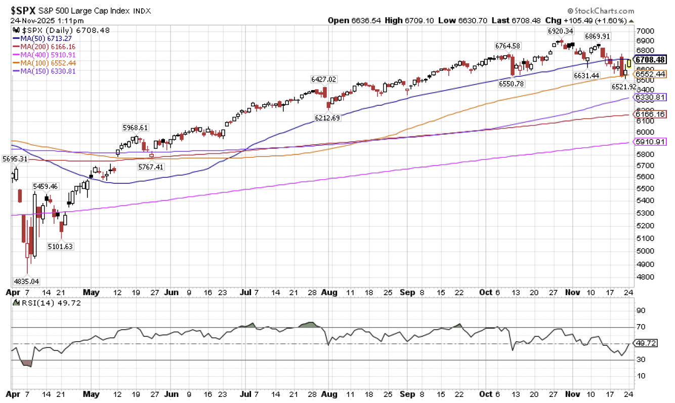 The S&P 500 landed on its 100-day moving average (orange line) to close out the trading day last Thursday.  It opened on this same line on Friday, tried to make a push below it during the trading day, failed, and marched its way back higher to close above this support line to close out the week.  What have we seen so far during Monday’s trading?  The S&P 500 is making a run at breaking back above its 50-day moving average support line, which I’m not yet ready to declare is resistance (you’ve got to spend a length of time longer than what it takes for milk to go bad in your fridge before you can declare that a previous support line is broken).  Put simply, if the S&P 500 breaks out above 6715 between now and Thanksgiving (this will also require the Relative Strength Index (RSI) to advance back above 50), it’s very likely game on back to the upside and we can return to shopping for our S&P 500 “7000+ Go Like Hell” signs to hide behind the Christmas tree.