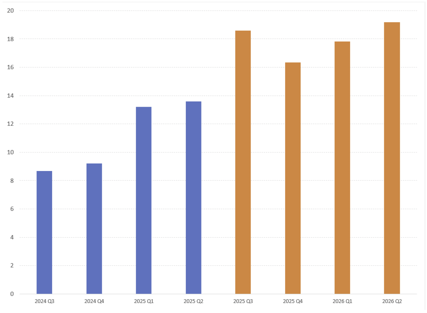 Second, corporate earnings growth needs to be trending lower if not outright declining before stocks are ready to fall into a sustained decline.  The importance of corporate earnings growth on stock prices cannot be overstated, as the correlation between stock prices and corporate earnings growth is very high over the past 155 years.  And when looking at the chart below from S&P Global (keeper of the S&P 500) that shows the annual GAAP earnings growth (%) on the S&P 500 for history (blue bars 2024 Q3 to 2025 Q2) and forecast (orange bars 2025 Q3 to 2026 Q2), we see bars that are steadily rising, not falling, into the high teens.  This robust rate of current and expected earnings growth would need to at least begin to show signs of cooling off before we would start to become concerned about a sustained market correction or pending bear market if more than 150 years of history is any guide.